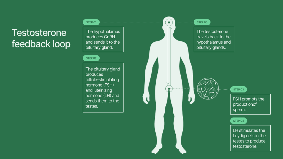 - The testes produce testosterone which travels in the bloodstream back to the hypothalamus, giving the body feedback on how much testosterone is needed.